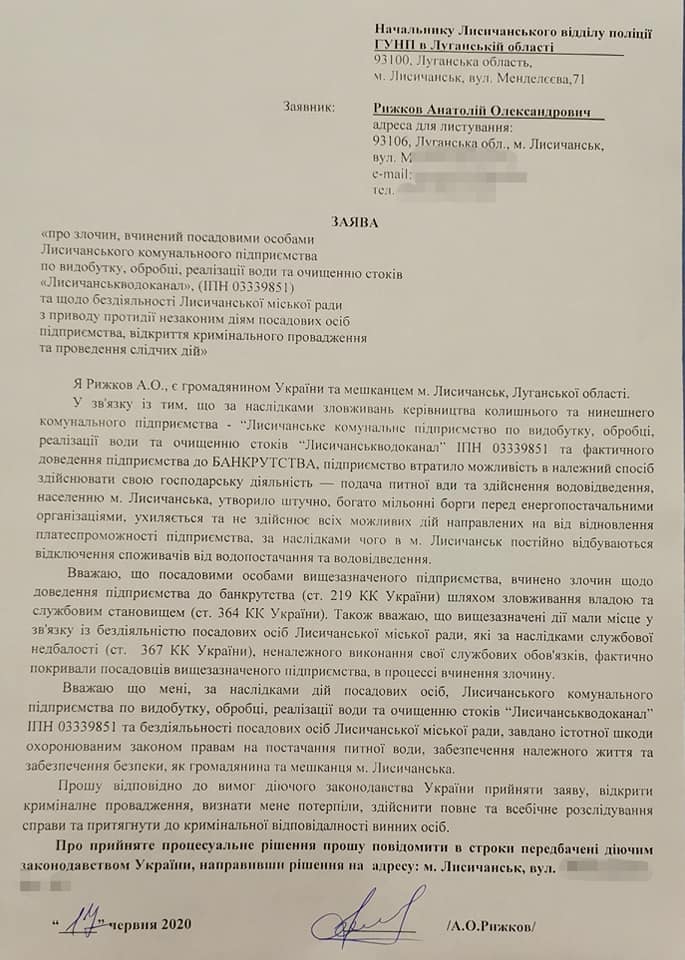 Общественный активист из Лисичанска Анатолий Рыжков подал заявление в полицию на руководство ЛКСП "Лисичанскводоканал".