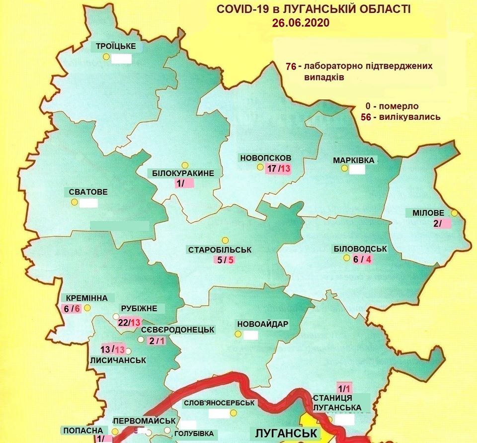 По состоянию на 26 июня 2020 г. на Луганщине зарегистрировано 76 лабораторно подтвержденных методом ПЦР случаев COVID-19, из них 3 медицинских работников.