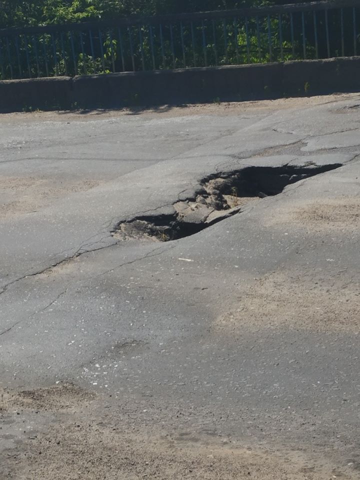 Как можно увидеть, на проезжей части моста и на тротуаре зияют дыры, местами нет перил.