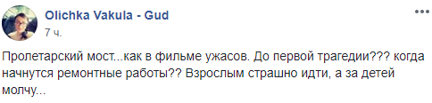 "Пролетарский мост... как в фильме ужасов. До первой трагедии??? когда начнутся ремонтные работы?? Взрослым страшно идти, а за детей молчу..." - пишет автор поста.