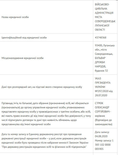 В едином государственном реестре юридических лиц сегодня, 4 июля, была зарегистрирована военно-гражданская администрация г. Северодонецка Луганской области.