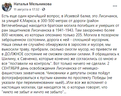 Прогуливаясь в этой местности с семьей, женщина случайно обнаружила братскую могилу, утопающую в сорняках и мусоре. Там захоронено более 800 военных, погибших при освобождении Лисичанска во время Второй мировой войны. Только 205 человек из них были опознаны. Однако местные власти, очевидно, плевали на память тех, о ком постоянно говорят, что "никто не забыт и ничто не забыто".