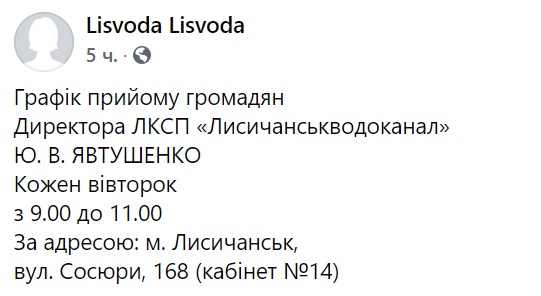 Директор ЛКСП "Лисичанскводоканал" Юрий Явтушенко будет проводить прием граждан каждый вторник.