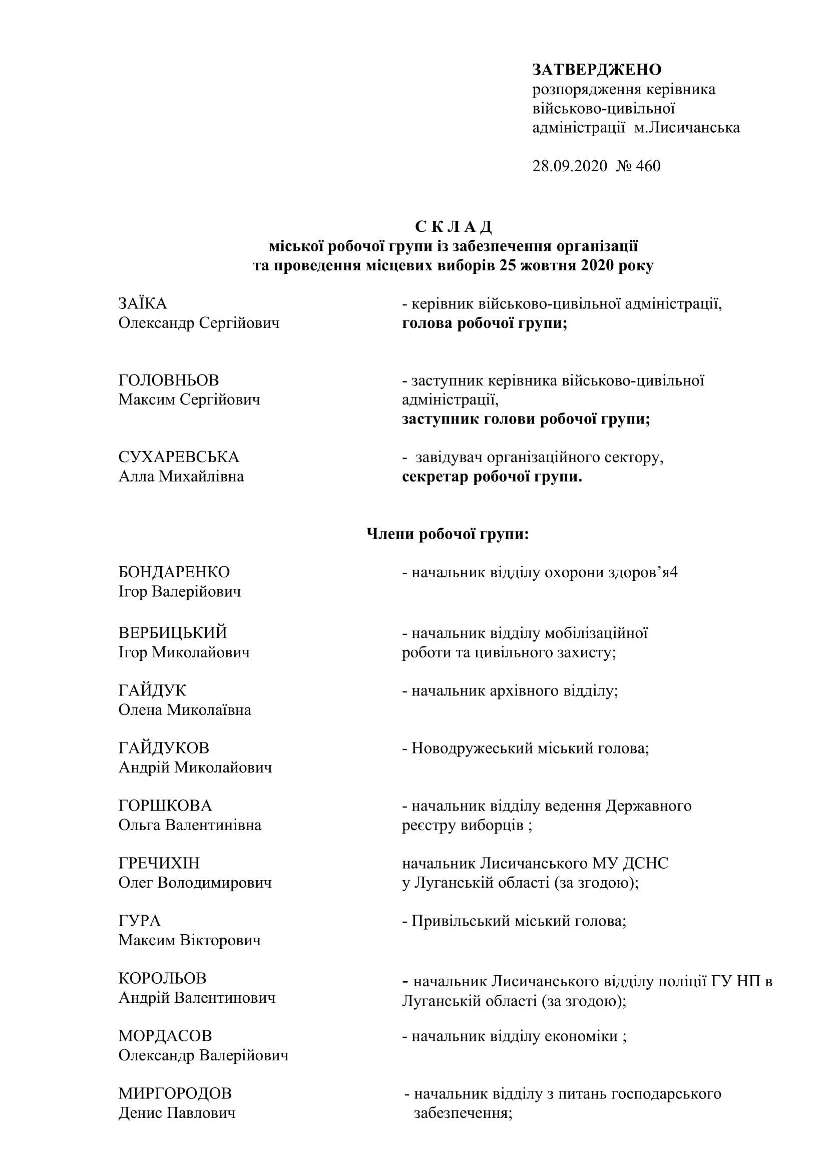 Заика распорядился создать городскую рабочую группу по обеспечению организации и проведения местных выборов 25 октября 2020 года, утвердив ее в составе согласно приложению.
