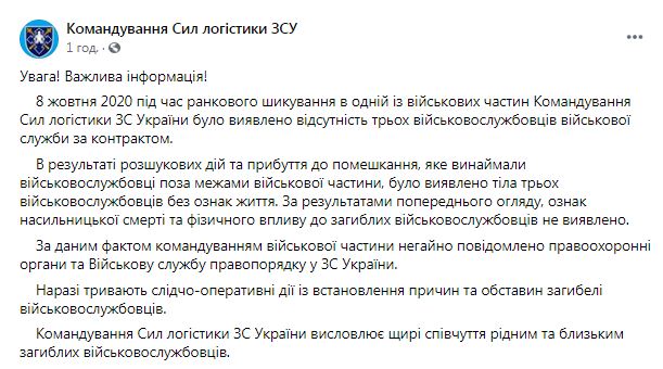 На Житомирщине в селе Новоивницком Андрушевского района на съемной квартире утром, 8 октября, обнаружили мертвыми трех военнослужащих, которые проходили службу по контракту. Телесных повреждений ни у одного из них обнаружено не было.
