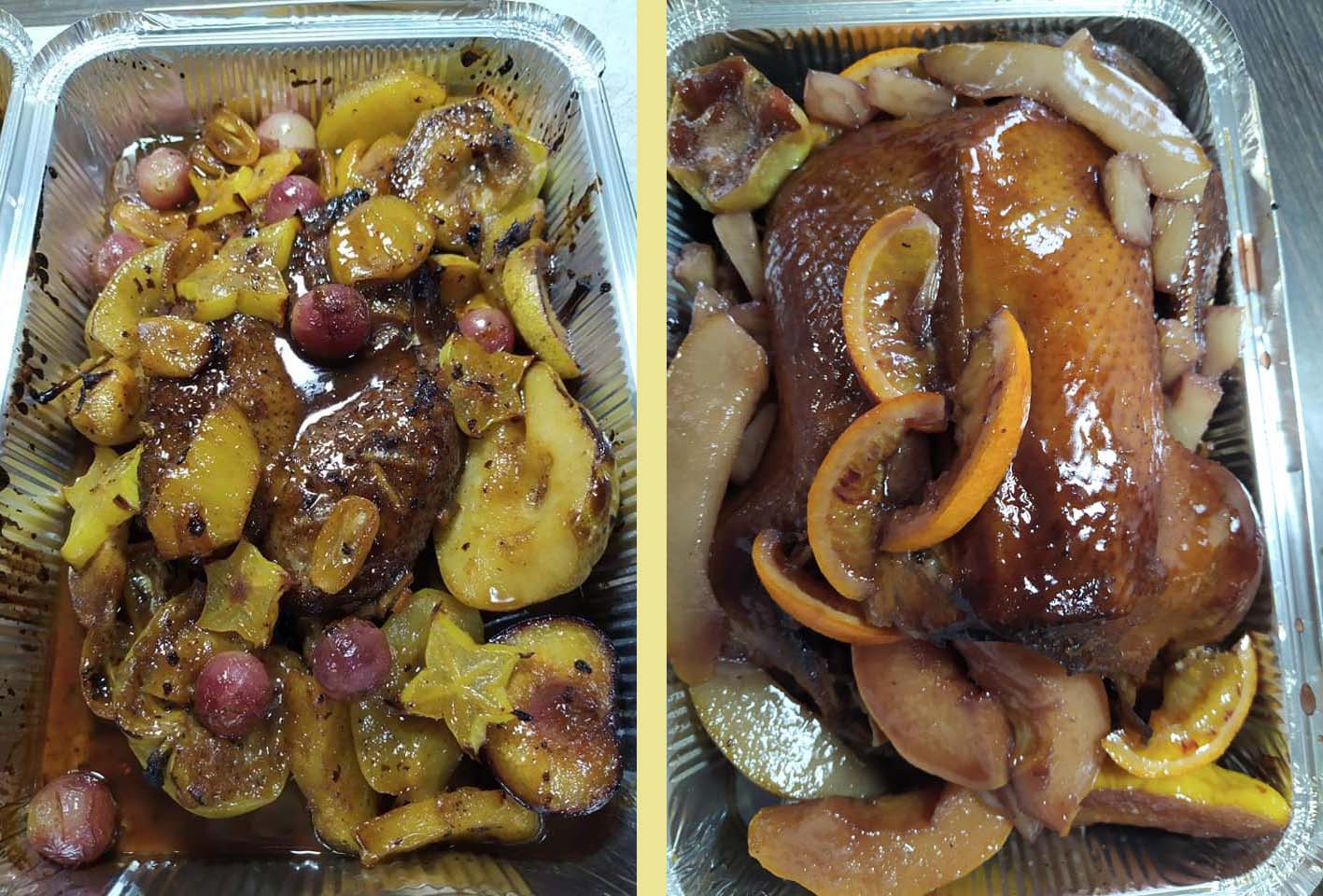 Для запеченной утки варю соленую карамель, в которой два вида груш, два вида яблок, кумкват и звездочки карамболы. Утка запекается, а потом поливается карамелью.
