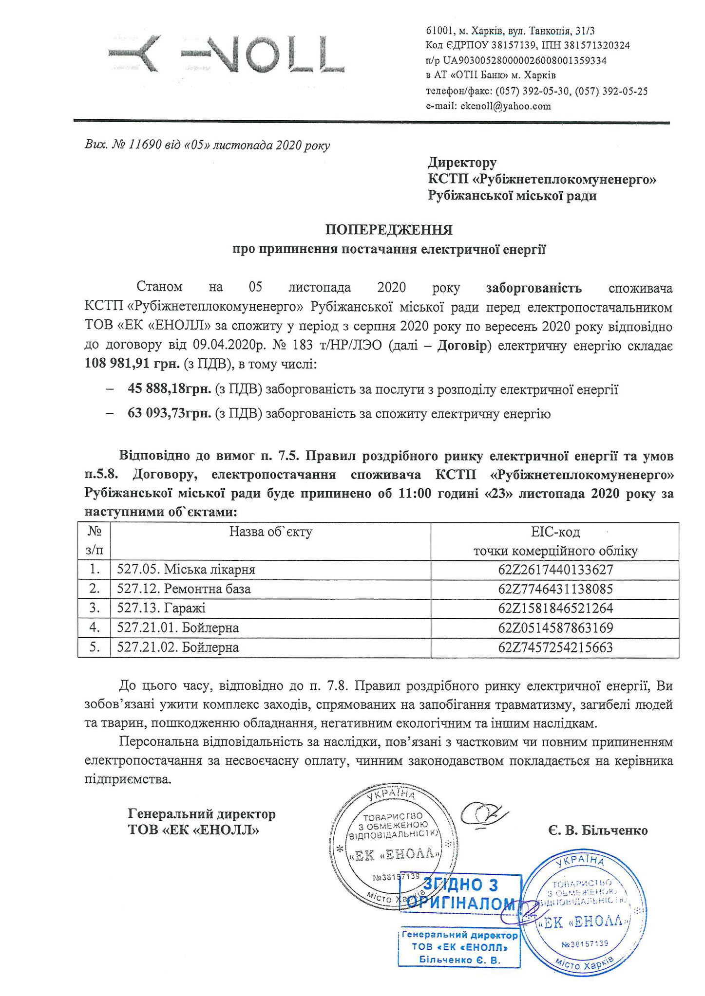 "23.11.2020 и 27.11.2020 года будет прекращено предоставление услуг по распределению электрической энергии объектам потребителя КСТП "Рубежнетеплокоммунэнерго" Рубежанского городского совета по требованию ООО "ЭК"ЭНОЛЛ" из-за существующей задолженности", - говорится в сообщении.