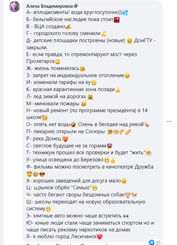 Когда мы попросили жителей Лисичанска в Фейсбуке сделать городскую азбуку за 2020 года, то в ответ нам предложили вариант для идеальной концовки алфавита.