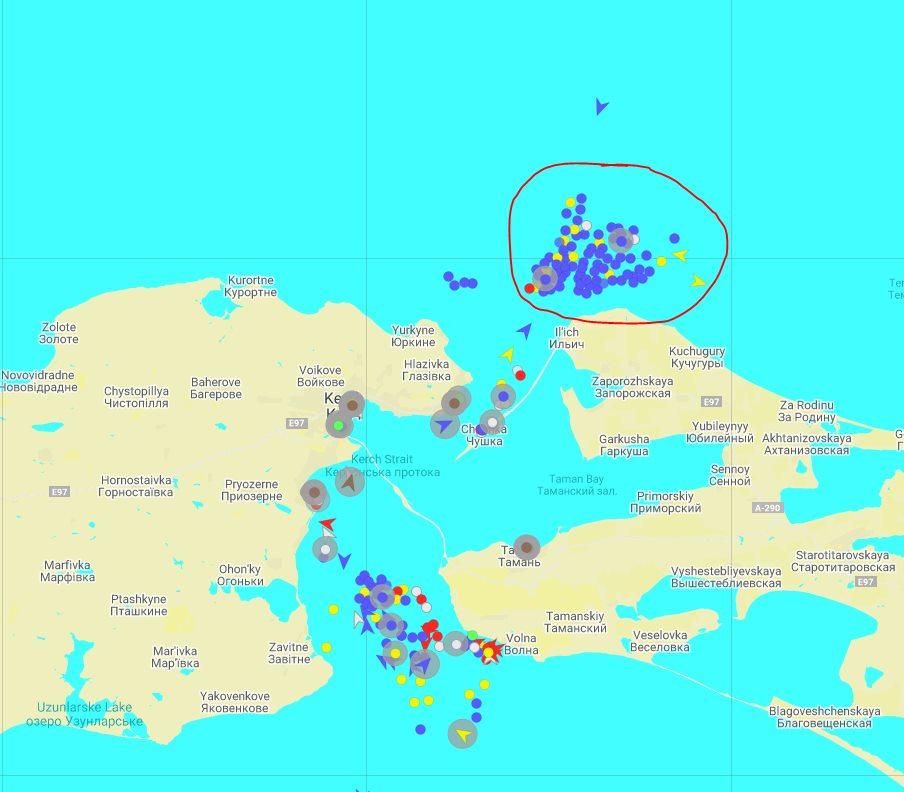 Он опубликовал карту, на которой показано огромное скопление судов РФ (более 100) на выходе из Керченского пролива. Все они идут на север - в Ростов-на-Дону и дальше.
