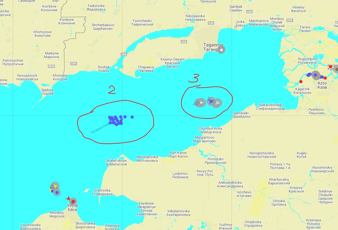 На втором фото - ситуация в Таганрогском заливе группа судов более 20 чего-то ждет (пометка 2) и небольшая группа судов идет в Ростов (пометка 3).