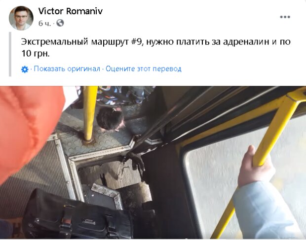 Украинский общественный транспорт не перестает удивлять. На днях в Луцке заметили маршрутку, в которой отсутствовала часть пола.