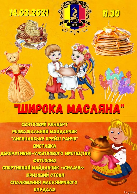 14 марта в 11.30 лисичан приглашают на площадь Победы на общегородское культурно-массовое мероприятие "Широкая Масленица". Горожан ждут: праздничный концерт, развлекательная площадка "Лисичанское крейзи ранчо", выставка декоративно-прикладного искусства, фотозона, спортивная площадка "Силачи", призовой столб и сожжение масляничного чучела.