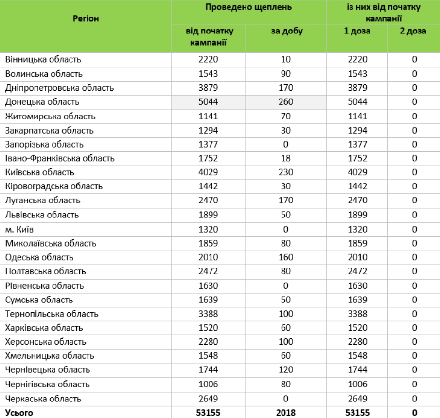 В Украине вакцину получили 53 155 человек, в том числе 2018 за прошедшие сутки. Прививки проводились 58 мобильными бригадами по иммунизации.
