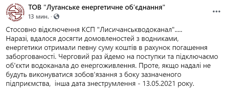 На данный момент удалось достичь договоренностей с водниками, энергетики получили определенную сумму средств в счет погашения задолженности. В очередной раз идем на уступки и подключаем объекты водоканала к энергопитанию. Однако, если в дальнейшем не будут выполняться обязательства со стороны указанного предприятия, другая дата обесточивания - 13.05.2021 года", - сказано в публикации.