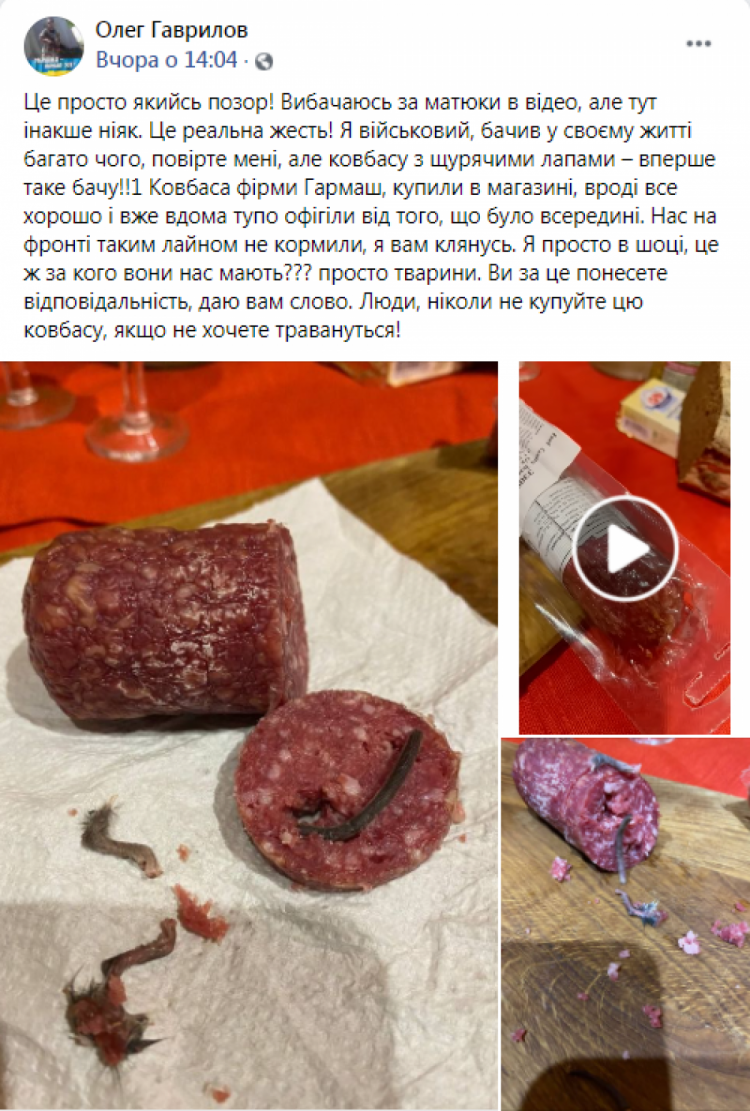 "Это реальная жесть! Я военный, видел в своей жизни много чего, поверьте мне, но колбасу с крысиными лапами - впервые такое вижу!", - пишет автор поста.