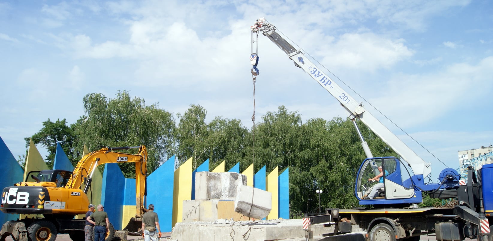 Как отмечается, сегодня с самого утра продолжаются работы на площади Победы. Спецтехника работает над демонтажем постамента бывшего памятника В.И.Ленину. Общий вес конструкции, которая демонтируется, более 100 тонн.