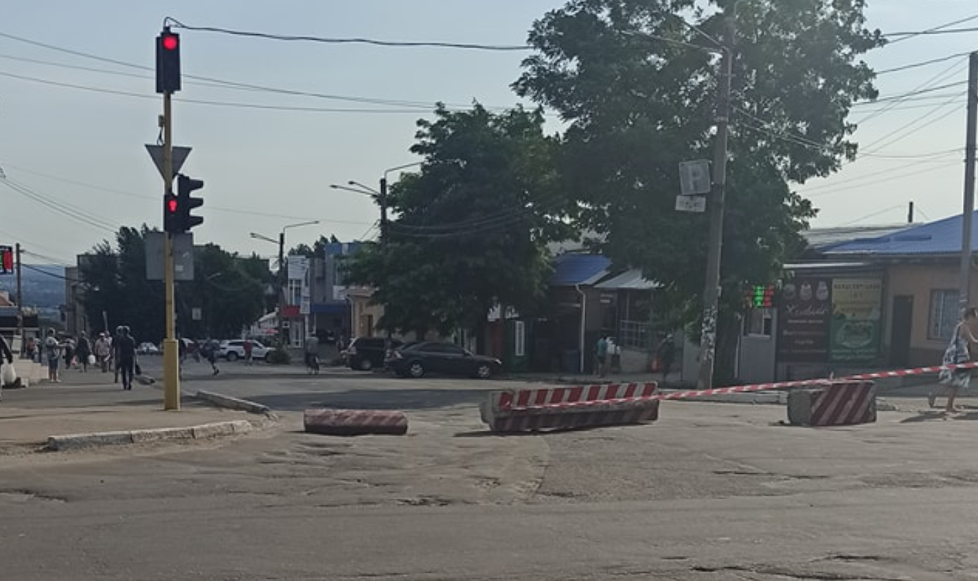 На снимке видно, что дорога возле центрального рынка перегорожена бетонными блоками, натянута сигнальная лента.