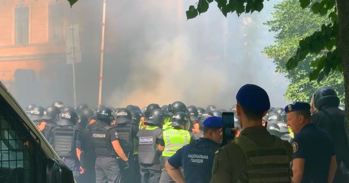 По информации украинских СМИ, часть улицы Банковой была в дыму от дымовых шашек, которые, вероятно, летели со стороны активистов, и слезоточивого газа, который применила полиция, передает Час Пик.