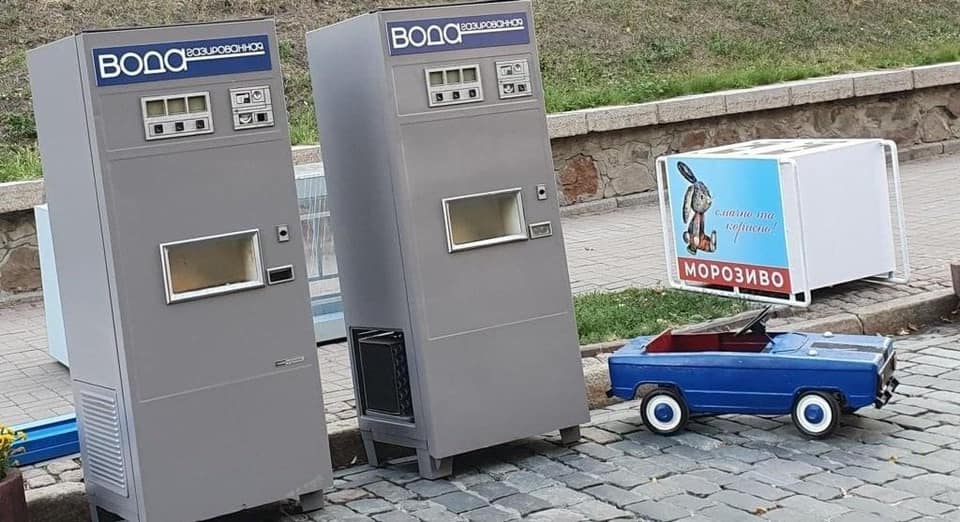 На Аллее Героев Небесной Сотни установлены советские автоматы с газировкой, холодильник с мороженым, а также декорации типичной советской квартиры.