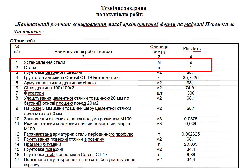 В объявлении тендера указаны виды работ, которые нужно выполнить. Первыми значится стела - 9 метров.