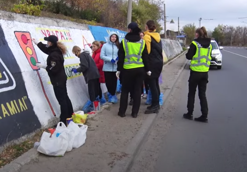 Ученики Лисичанской гимназии нарисовали мурал на стене вдоль проезжей части возле своего учебного заведения, чтоби привлечь внимание водителей к пешеходному переходу.
