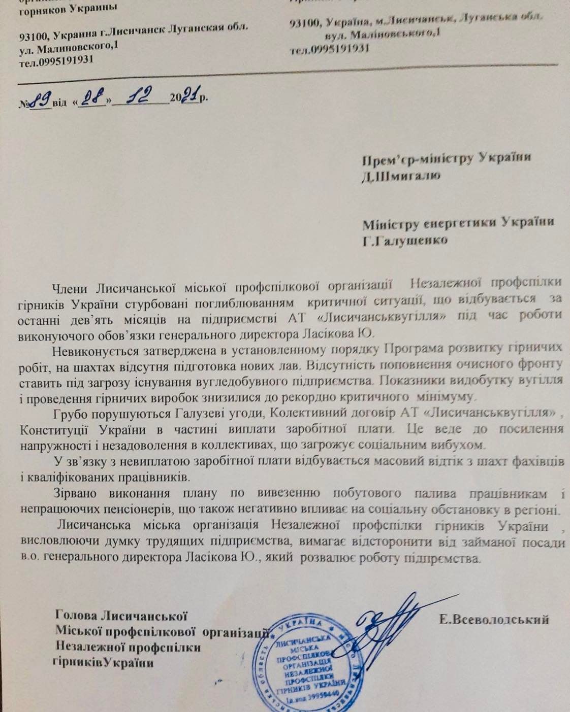 В данном письме Лисичанская городская организация Независимого профсоюза горняков Украины, выражая мнение трудящихся предприятия, требует отстранить Ласикова от занимаемой должности.