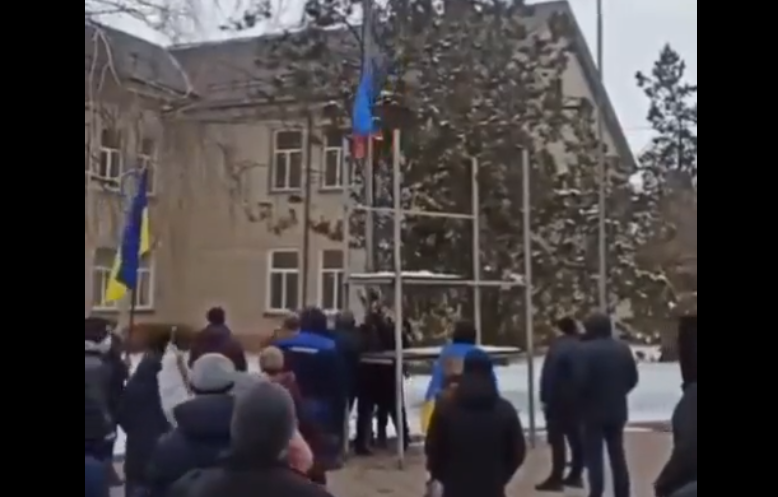 Люди пришли на площадь с украинской символикой и флагами, пели гимн Украины и сорвали с флагштока флаг так называемой "ЛНР", который туда нацепили путинские вояки.