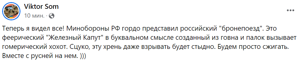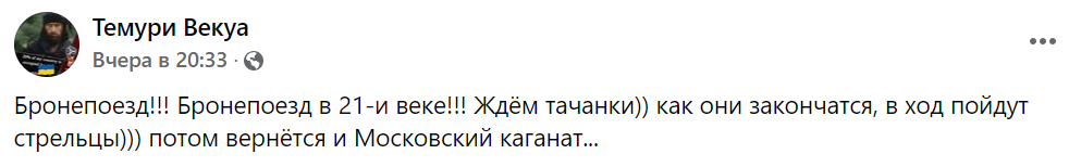 "Россия извлекла из глубокого резерва времен противостояния на границе СССР и Китая бронепоезд. Тот самый, что "стоял на запасном пути", - говорится в публикации в местном Фейсбук-сообществе.