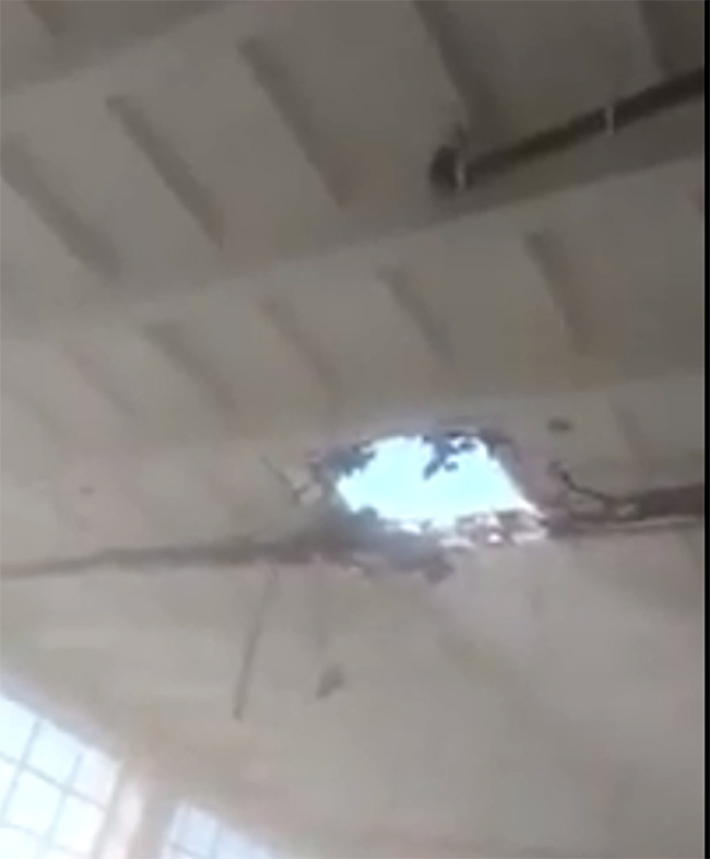 На видео видна огромная дыра в крыше спортзала, предположительно, результат работы вражеской артиллерии.