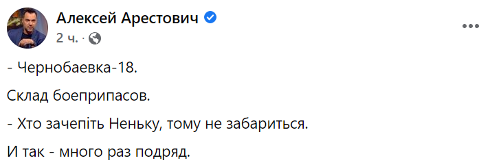 В районе легендарной Чернобаевки был уничтожен склад боеприпасов россиян. Об этом сообщил советник главы Офиса президента Украины Алексей Арестович, передает Час Пик.