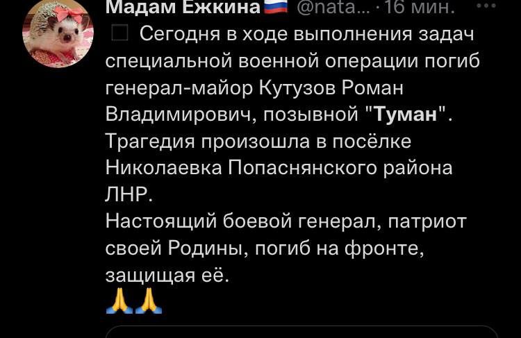Российский пропагандист Александр Сладков в своем Телеграм-канале пишет, что Кутузов погиб, "поведя в атаку" своих подчиненных.