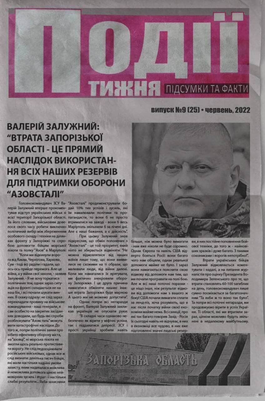 По данным ЦПД, враг распространяет фейковые газеты, в которых присутствуют сфабрикованные заявления главнокомандующего ВСУ Валерия Залужного и советника главы Офиса президента Алексея Арестовича о якобы "потере Запорожья" и "отчаянии" среди украинских военных.