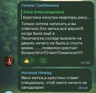 Лисичане предположили, что метки можно трактовать двояко. Иногда так двери помечают сами жители квартир для защиты. Однако некоторые утверждают, что кресты на внешней стороне двери появились уже после выезда хозяев из города.
