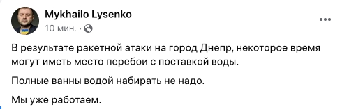 Позже заместитель мэра Днепра Михаил Лысенко в Facebook сообщил, что в городе в результате "прилетов" вражеских ракет могут возникнуть на некоторое время перебои с водой. Соответствующие службы уже работают над устранением проблемы.