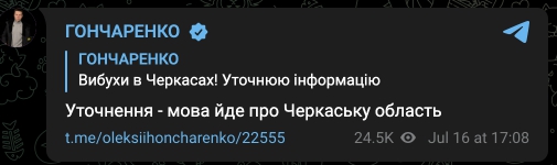 О взрывах на Черкасчине сообщил народный депутат Алексей Гончаренко в Telegram, передает Час Пик.