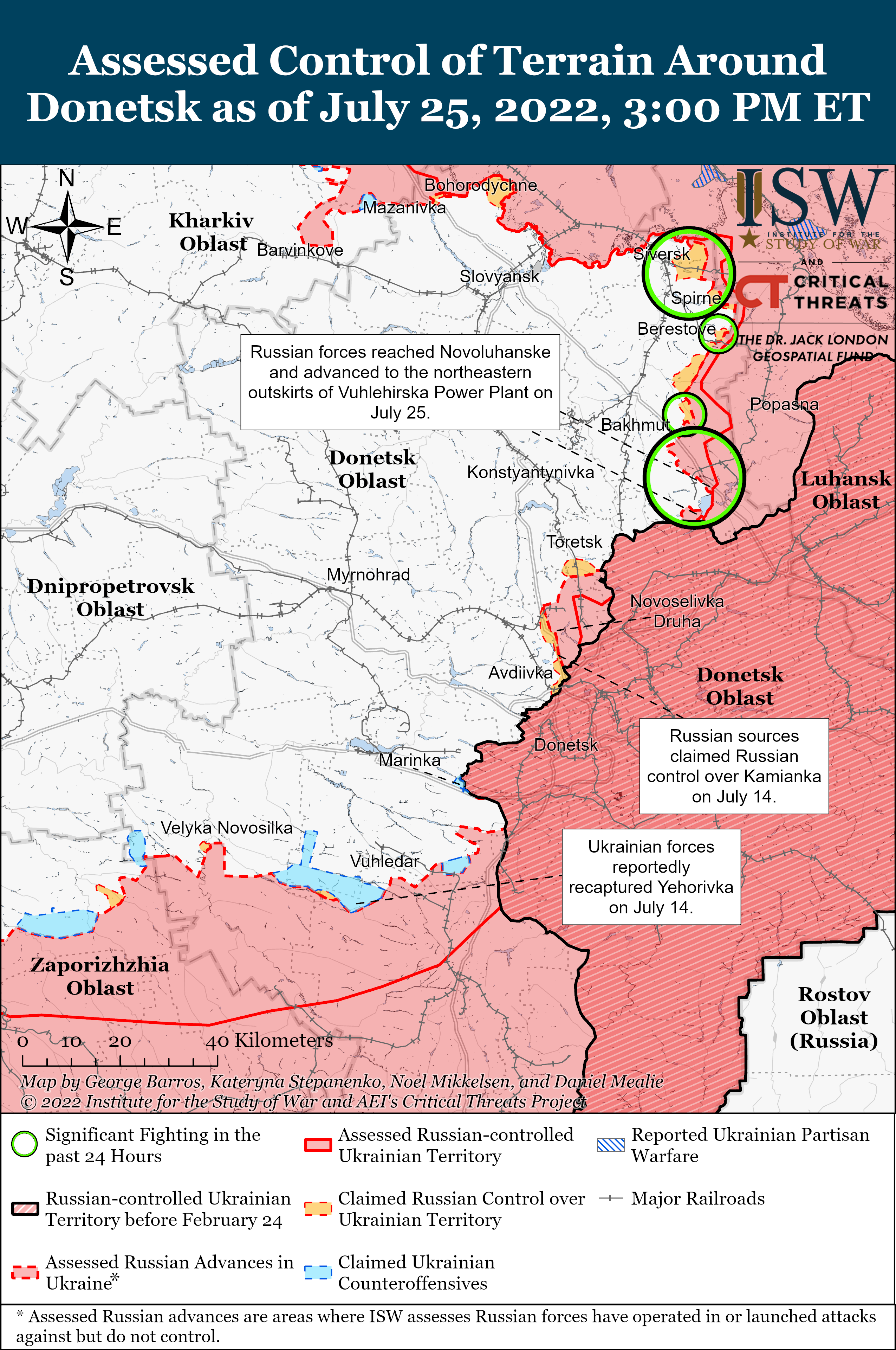 На видео по геолокации в социальных сетях от 25 июля видно, что войска частной военной компании "Группы Вагнера" (ЧВК) продвинулись в Новолуганское, а российские и украинские источники отмечают, что российские войска контролируют территорию Угледарской электростанции на северной окраине Новолуганского, вероятно, в результате контролируемого ухода украинских войск из этого района.