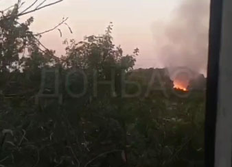 На кадрах слышны взрывы и виден пожар недалеко от частного сектора.