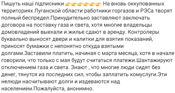 "Заставили платить, начиная с марта месяца, хотя в начале говорили, что только с мая будут считаться платежи. Шантажируют отключением газа и света. Знают, что многие люди сидят без денег, тянутся из последних сил, чтобы заплатить комуслуги. Эти нелюди насчитывают долги и издеваются над населением", - сообщают жители области.