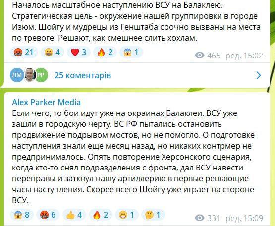 "В Балаклее ад… Сегодня утром укр* (ВСУ - ред.) перешли в наступление в районе н.п. Балаклея. Сейчас происходит подрыв мостов, ведущих в город. Противник закрепился на окраинах города", - написал российский ресурс.