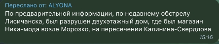 "Прилет", судя по сообщениям пользователей сети, был в центральной части Лисичанска. Более точная информация отсутствует.