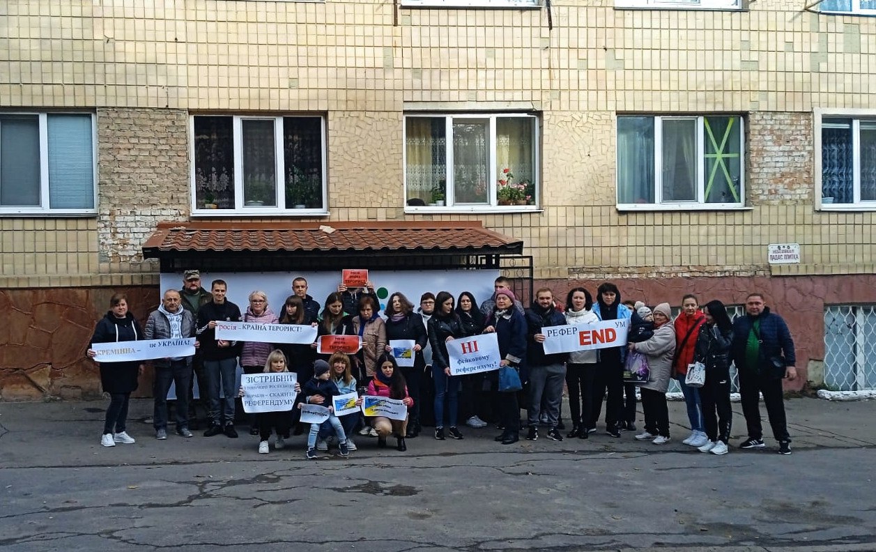 Они вышли с плакатами "Нет фейковому референдуму", "Кременная - это Украина", "реферendум".