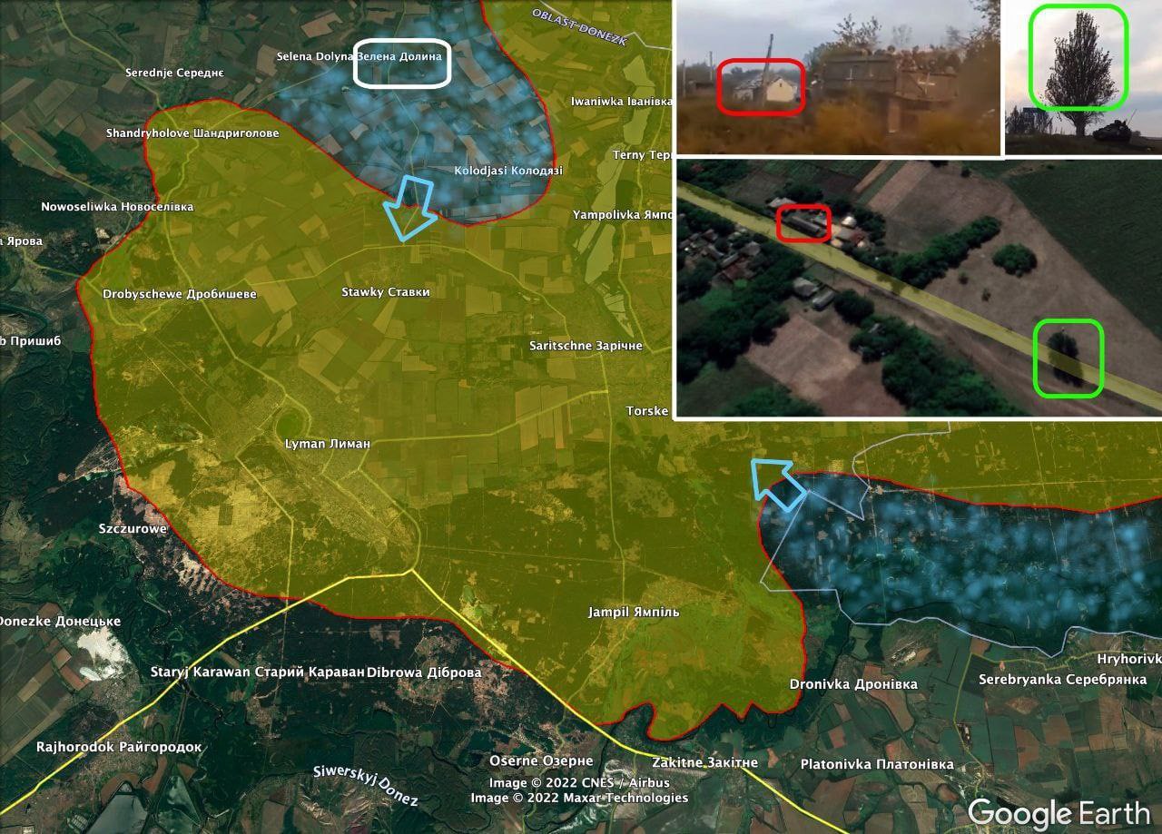 Вражеские источники сообщают еще более оптимистичные для нас данные: как утверждают россияне, украинские войска не только взяли под контроль населенные пункты Зеленая Долина и Колодези к северу от Лимана, но и форсировали реку Северский Донец к северу от Дроновки и Серебрянки и освободили часть леса возле Кременной.