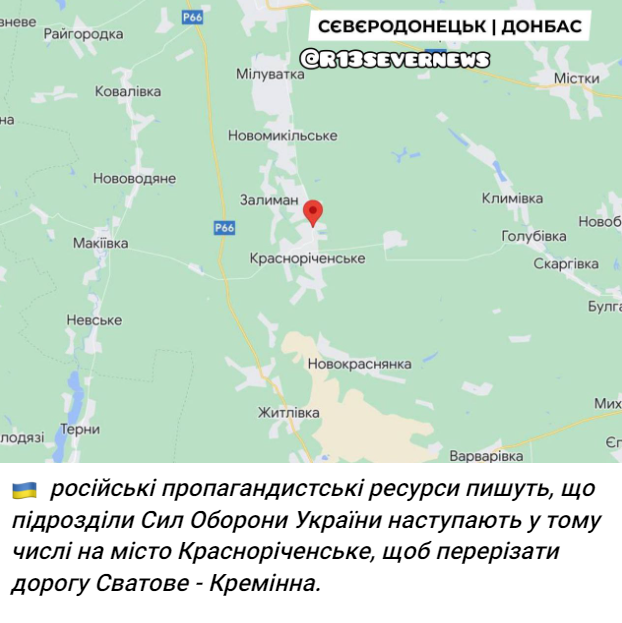 Российские пропагандисты заявляют, что ВСУ уже якобы штурмуют Краснореченское, чтобы перерезать дорогу от Сватово до Кременной.