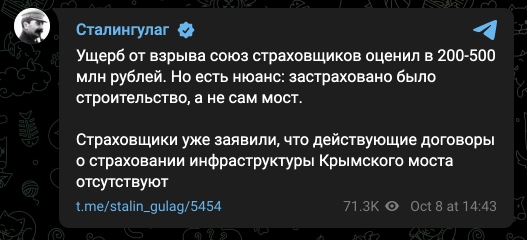 Также отмечается, что страховщики оценили ущерб от взрыва на мосту в 200-500 млн рублей. Однако сам мост застрахован не был - соответствующие договора о страховании Крымского моста отсутствуют.