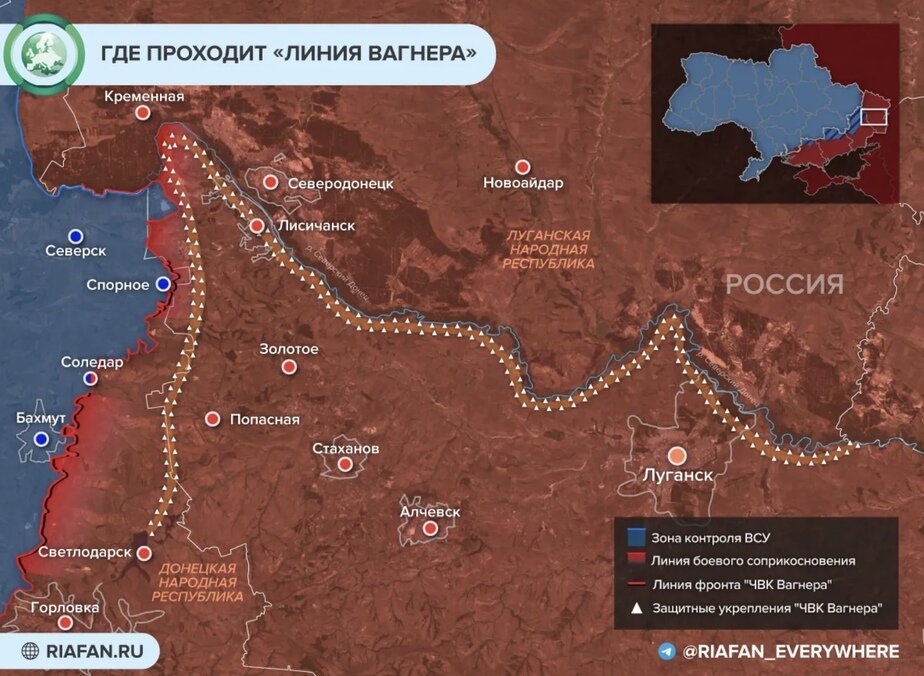 На днях пропагандистское издание "ФАН", связанное с хозяином ЧВК "Вагнера" Евгением Пригожиным, обнародовало карту, на которой показана та самая линия обороны.
