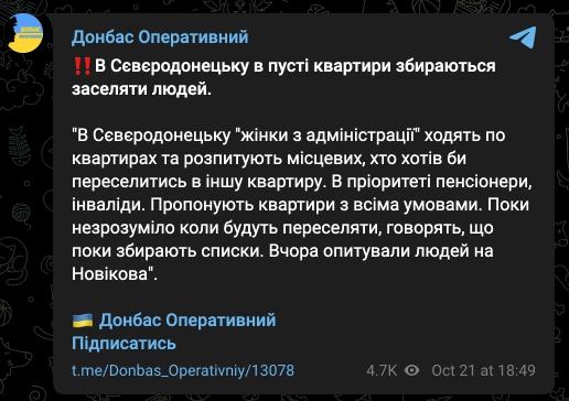 Напомним, ранее в соцсети сообщалось, что в Северодонецке прошло "совещание администрации" о расселении в пустующие квартиры. В Рубежном подобное мероприятие уже практикуется.