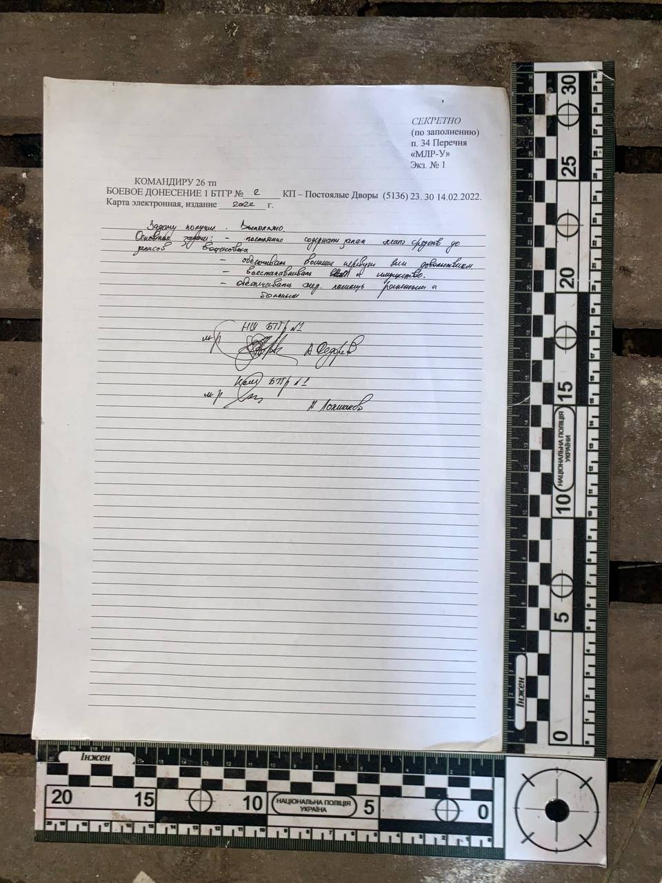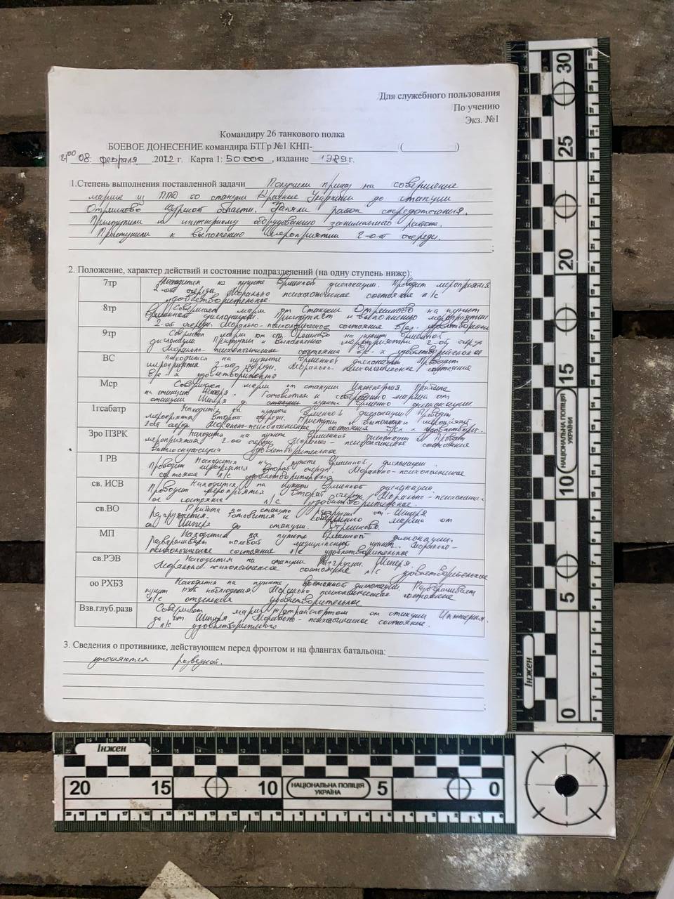 Среди выявленных вещественных доказательств – секретное боевое распоряжение военных РФ на вторжение в Украину, топографическая карта Харьковской области с маршрутом движения, списки личного состава военнослужащих танковых бригад вооруженных сил РФ, документы структурных подразделений ВГА Изюмского района, учебных заведений, медицинских заведений, предпринимателей и коммунальных предприятий.