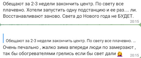 "Газ довели по Проспекту, дом 109. Обещают за 2-3 недели закончить центр. По свету все плачевно. Хотели запустить одну подстанцию и ее раз.... ли. Восстанавливают заново. Света до Нового года не будет", - сообщают жители города.