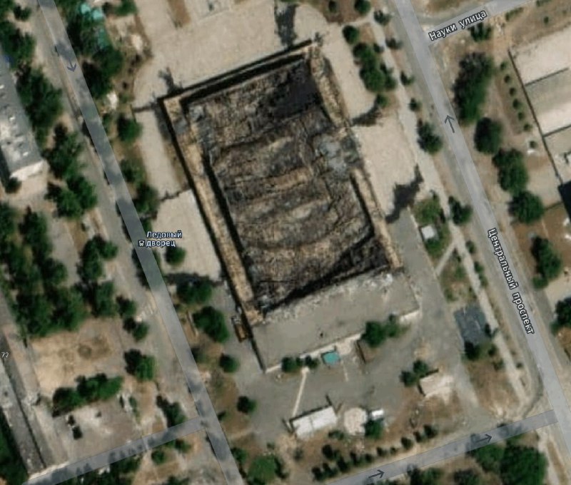 Зато на снимках можно увидеть сожженный дотла Ледовый дворец, обстрелянный храм, ДК Химиков, "Импульс" и другие объекты.