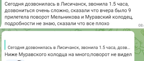 "Сегодня дозвонилась в Лисичанск, звонила 1.5 часа, дозвониться очень сложно, сказали что вчера было 9 прилетела поворот Мельникова и Муравский колодец, подробности не знаю, сказали что все плохо", - сообщают в сети.
